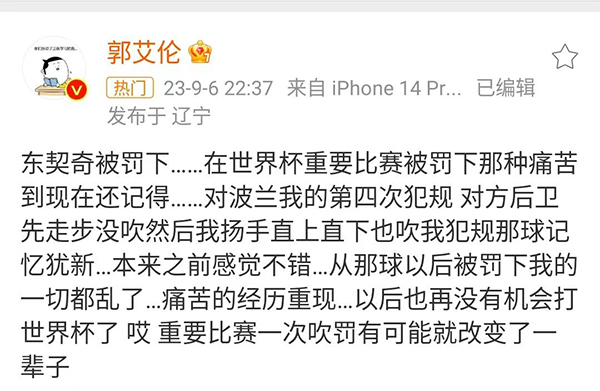 杨鸣是在内涵郭艾伦吗?在这事慢慢升级后,郭艾伦在22时也是进行了回应。为什么爱和裁判理论呢?郭艾伦表示:“东契奇被罚下……在世界杯重要比赛被罚下那种痛苦到现在还记得……对波兰我的第四次犯规 对方后卫先走步没吹然后我扬手直上直下也吹我犯规那球记忆犹新…本来之前感觉不错…从那球以后被罚下我的一切都乱了…痛苦的经历重现…”