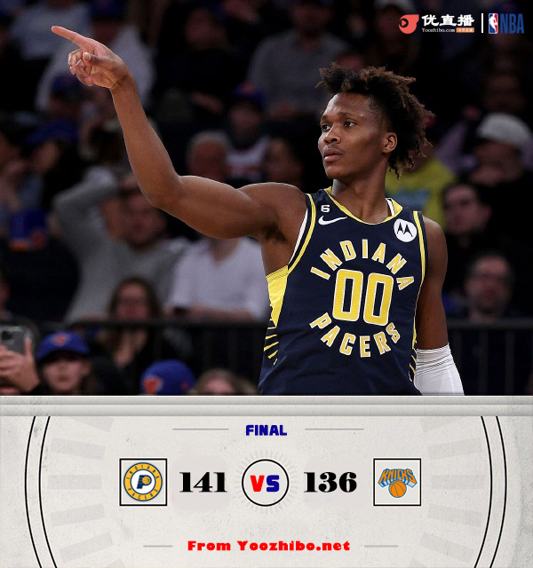 24直播网4月10日讯 NBA常规赛最后一轮,尼克斯主场迎战步行者。尼克斯已锁定东部第五,但本场除兰德尔和布伦森外主力悉数出战。步行者无缘附加赛。上半场,双方火力全开大打对攻,马瑟林和沃拉高效输出,尼克斯多点开花一度取得两位数优势,步行者奋力反击里突外投完成反超,半场战罢步行者73-71领先。下半场,尼克斯一波13-3重夺领先,步行者外线开火连中三分努力追赶,末节尼克斯突然断电,步行者大举进攻将比分反超并取得两位数优势,尼克斯苦苦追赶无果。最终,步行者141-136击败尼克斯,客场胜利收官。