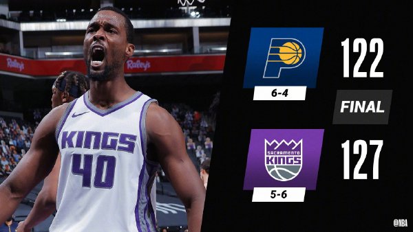 步行者(6-4):萨博尼斯28分11篮板3助攻,布罗格登24分4篮板9助攻,麦克德莫特21分4篮板,奥拉迪波21分4篮板4助攻4抢断,贾斯丁-霍勒迪8分5篮板2助攻1断,迈尔斯-特纳6分6篮板4助攻2断3帽,阿隆-霍勒迪4分3断,萨姆纳8分3篮板2助攻,桑普森2分1篮板。