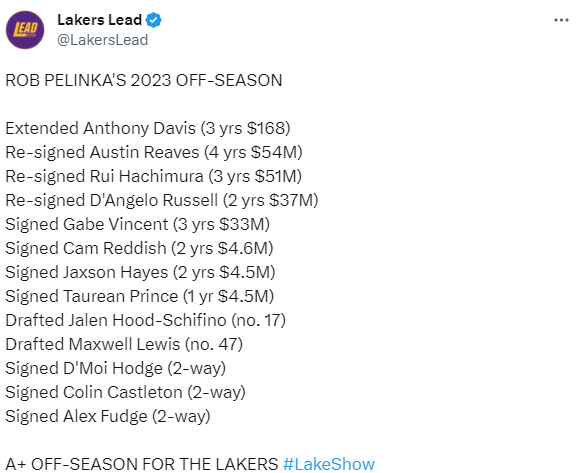 今夏湖人4年5400万美元续约里夫斯、3年5100万美元续约八村垒、2年3700万美元续约拉塞尔,以及与浓眉提前续约超级顶薪,湖人还引援文森特、雷迪什、海斯、普林斯等人,詹姆斯和浓眉领衔这一套新的冲冠阵容。