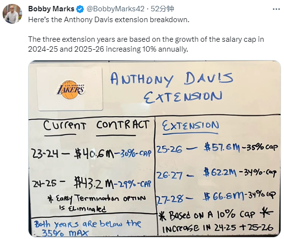 浓眉和湖人提前续约,如此一来,他和湖人的合同将持续到2028年,5年总价达到2.7亿美元,薪资专家Bobby Marks详解浓眉合同细节,具体情况如下——