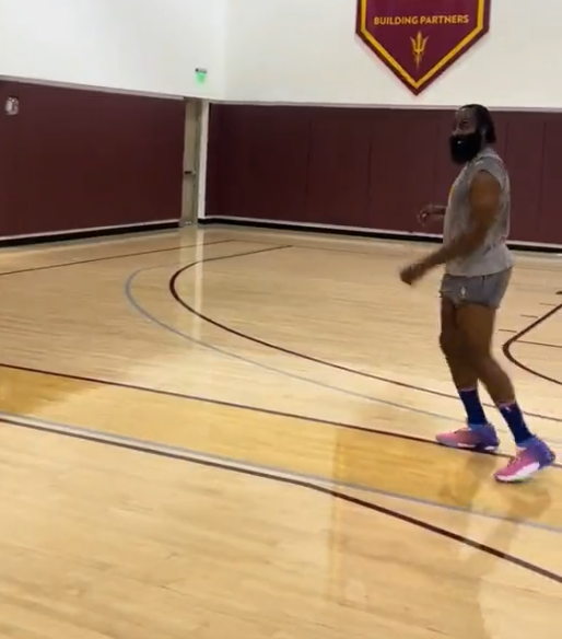 哈登最新训练曝光:挥汗苦练连中招牌三分 身材未走样并咧嘴大笑