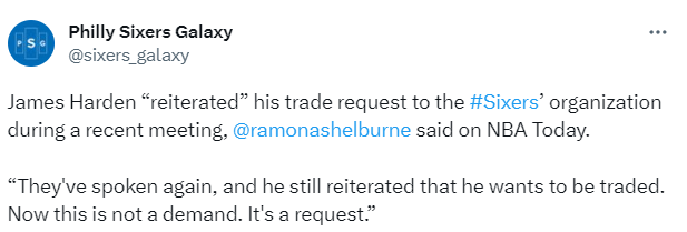 ESPN记者Ramona Shelburne透露,他们又会谈了,他(詹姆斯-哈登)仍然重申自己想被交易离队。现在这不是一个要求,这是一次申请;我认为76人已经对他说‘好的,我们会尝试交易你’,但他们现在并不急于这么做。