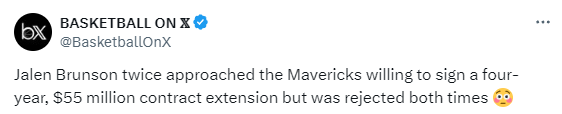 从布伦森的爆料来看,独行侠两次拒绝与他续签4年5500万美元合同,等到独行侠想和布伦森续约时,布伦森不仅拒绝续约,而且想要加盟离家更近的尼克斯,很明显,独行侠高管的操作让大头伤心了。
