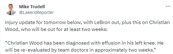 湖人官方还公布了伍德的伤情,伍德被诊断出左膝积液,队医将在两周后对其伤势进行复查。