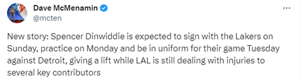Dave Mcmenain报道,丁威迪将在下周一与湖人签约,周二与湖人一起合练,周三将身穿湖人战袍出战与活塞的比赛,换言之,丁威迪将在周三迎来湖人生涯首秀。