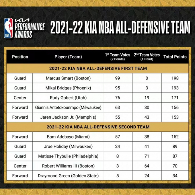 字母哥(雄鹿、156分)、米卡尔-布里奇斯(太阳、193分)、戈贝尔(爵士、171分)、小贾伦-杰克逊(灰熊、153分)、斯玛特(凯尔特人、198分)。