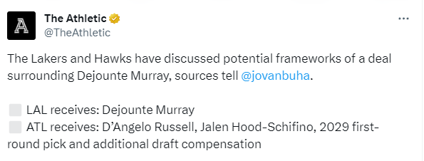 此前湖人队记Jovan Buha曾报道,湖人和老鹰已经商讨过关于穆雷交易的潜在框架,上周,湖人与老鹰商讨关于穆雷的交易,报价拉塞尔、席菲诺、2029年首轮签和额外的选秀补偿(首轮签互换权或次轮签),但老鹰索要里夫斯,之后双方谈判陷入停滞,预计两队将在接近截止日重启谈判。