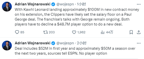 名记woj进一步报道,小卡续签前拒绝了下赛季4870万美元的球员选项,这份新合同第一年薪资为5200万美元,这取代了小卡上一份合同的球员选项,后两年的年薪都是5000万美元。