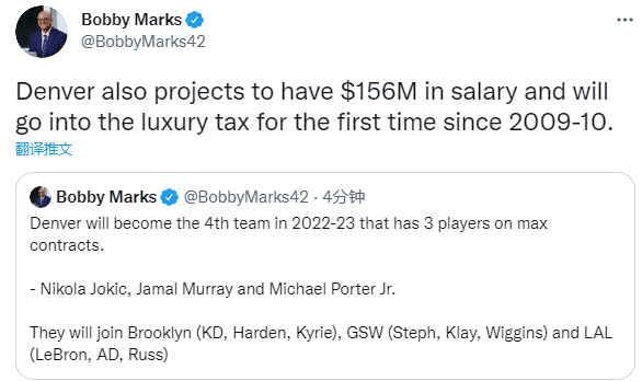根据记者BobbyMarks报道,掘金也将成为目前第四支在2022-23赛季拥有3位顶薪球员的球队,其他三支球队分别为篮网(杜兰特、哈登和欧文)、勇士(库里、汤普森和维金斯)和湖人(詹姆斯、浓眉和威少)。