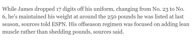 来源:24直播网09-24 11:1124直播网9月24日讯 ,湖人总经理佩林卡表示詹姆斯有所减重,而ESPN随后跟进报道称,所谓的“减重”其实是增肌。詹姆斯目前的体重还和上赛季差不多,都是250磅(约113公斤)左右,据悉他的休赛期计划更多是增添纤细的肌肉,而不是单纯的减少体重。