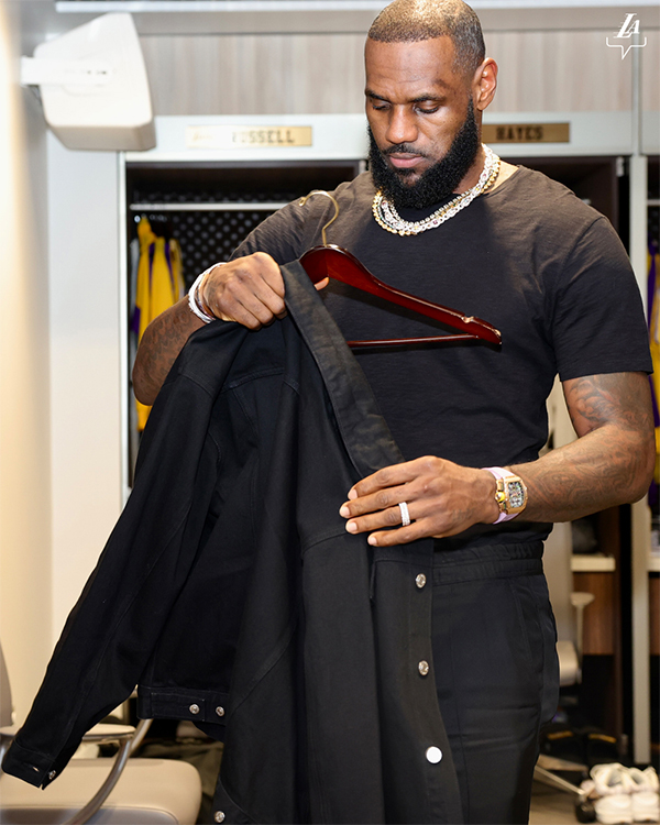 距离湖人与黄蜂比赛开打还有4个半小时,即将39岁的詹姆斯便早早入场,身穿黑色长裤、黑色夹克和白色板鞋走进湖人球馆,戴着墨镜十分霸气;来到更衣室中,詹姆斯脱掉外套,脖子上的几条大金链子十分显眼,还戴着名表以及镶钻戒指,凸显土豪范。