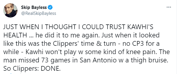 小卡受伤,快船季后赛还有戏吗?名嘴贝勒斯发推写道:就在我以为我可以相信小卡健康的时候,他又伤了,膝盖痛疼不会再打比赛了,他曾在马刺因大腿挫伤缺席了73场比赛,因此快船已经完了。