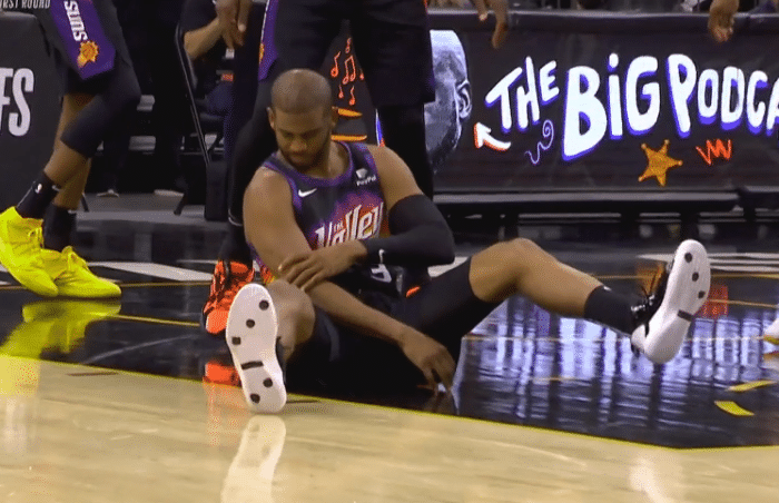 湖人这边一不顺百不顺,詹姆斯上篮,球转了一圈又出来了,布克三分再中,詹姆斯追身三分回应,施罗德犯规,比赛中断场上发生了突发情况,保罗十分痛苦地倒在了地上,在卡位的时候马修斯撞到了保罗的肩部,比赛暂停回来保罗上罚球线,镜头给到他的时候,保罗的眼里含着泪花,给人的感觉快要哭了,随后他十分沮丧的回到了更衣室。