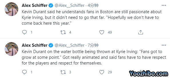 杜兰特替欧文抱不平,直言这球迷的妈妈也为他感到丢人;G3和G4,欧文只要一拿球就被球迷狂嘘以及辱骂,但扔水瓶太过分了。