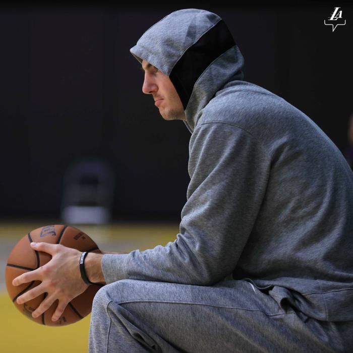 卡鲁索身穿灰色连帽卫衣,双手抱球坐在场边,露出发狠的表情,湖人官推写道:卡鲁索时刻准备着。