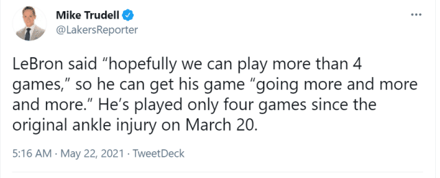 詹姆斯表示,季后赛第一场就是用来找感觉的比赛,但他希望球队作为一个整体仍然要发挥出之前比赛的强度。“我希望我们(这轮系列赛)能打超过4场比赛,这样我的状态会越来越好。”湖人记者Mike Trudell指出,自从3月21日脚踝首次受伤以来,詹姆斯只打了4场比赛。他确实需要更多的比赛来恢复状态。