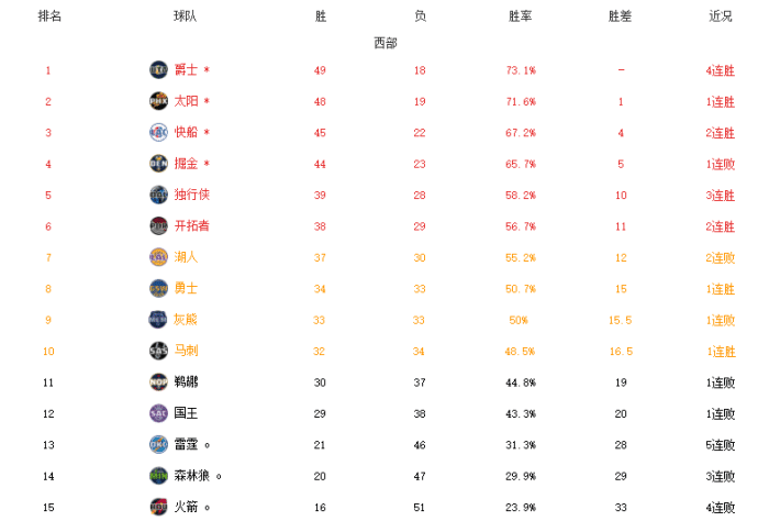 来源:24直播网05-08 15:2724直播网讯 今天NBA常规赛关注度非常高,尤其是西部的格局发生了很大的变化,其中就包括爵士一波4连胜,很有可能提前锁定常规赛西部第一。掘金输球让第三的快船渔翁得利。开拓者和湖人展开生死战,湖人输球之后跌至附加赛。鹈鹕输球后马刺收到利好消息。接下来我们一起来看看西部最新排名: