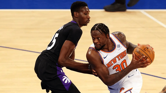 24直播网讯 今天NBA常规赛继续进行,纽约尼克斯延续他们的出色表现,主场120-103战胜猛龙,稳居东部前四。兰德尔连续两场比赛至少砍下30分10篮板的数据,也是尼克斯最近8年来第一人,上一个做到的是安东尼。同时九连胜也是尼克斯过去25年以来的第二连胜纪录,他们目前的战绩来到34胜27负,55.7%的胜率;再加上球队近期的强势表现,这个赛季最大的黑马堪称纽约尼克斯。