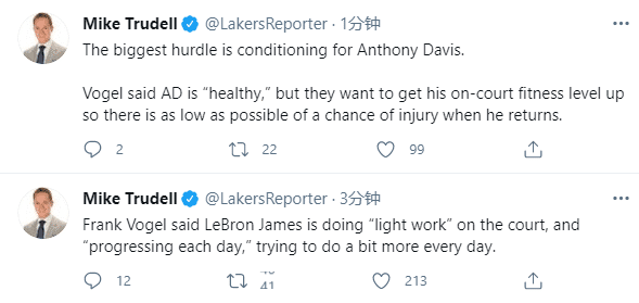 沃帅也透露詹姆斯的康复进展,詹姆斯在球场上做一些轻量的训练,他每天都在进步,每天都在努力做得更多。