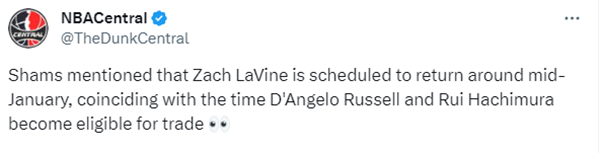 名记Shams在节目中表示:扎克-拉文计划在1月中旬左右回归,届时,恰逢湖人球员拉塞尔、八村垒两位球员变为可被交易资格的时间。