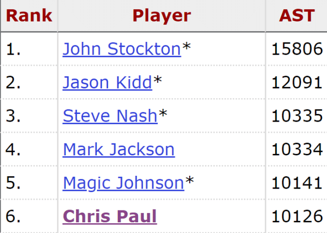 常规赛生涯至今,保罗累计送出10126次助攻,只需要再送出16次助攻,就能超越约翰逊(10141次助攻),升至历史第五位。以目前的情况来看,保罗有望在退役前再超越排名第四的马克-杰克逊(10334次)和第三的史蒂夫-纳什(10335次),但基本没有希望超过第二的基德(12091次)和第一的斯托克顿(15806次)。