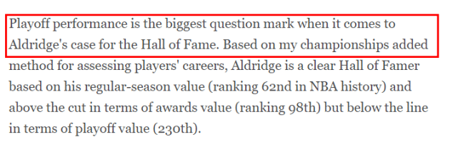 佩尔顿写道:“季后赛表现是阿德入选名人堂的最大问号。根据我的球员生涯数据模型,如果基于常规赛的价值,阿德毫无疑问是一位名人堂球员,他的常规赛价值排在历史第62位,但如果基于季后赛价值来看,他只排在历史第230位。”