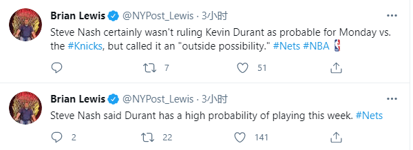 哈登因伤连续休战两场,杜兰特则是因伤连续缺席22场比赛,不过篮网完全体阵容即将首次合体,杜兰特和哈登有可能对阵尼克斯时一起复出;篮网六星豪阵相聚之时,便是联盟噩梦的开始,要知道三巨头仅仅在一起打过七场比赛,战绩6胜1负。
