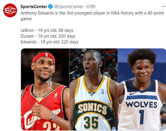 第二、爱德华兹年仅19岁225天轰下40+,超越安东尼、比肩詹姆斯和杜兰特成NBA历史上轰下40+第三年轻的球员,詹姆斯19岁88天时轰下40+高居历史第一。