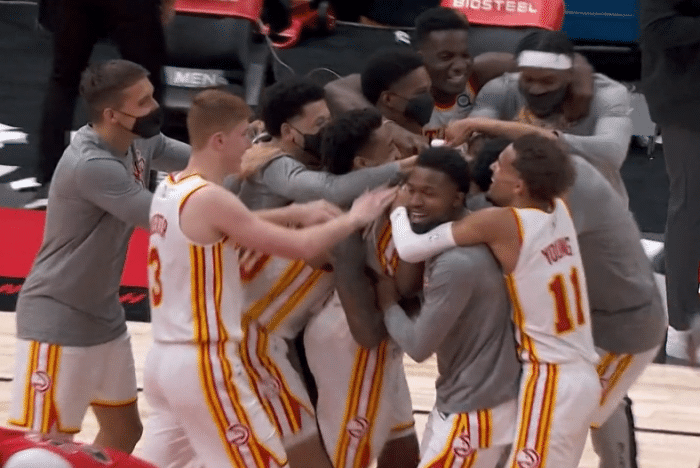 24直播网讯北京时间3月12日,NBA赛场诞生绝杀!在老鹰对阵猛龙的比赛中,斯内尔在比赛最后一刻接到特雷杨的传球,命中了压哨三分球绝杀!最终,老鹰121-120击败了猛龙,拿下3连胜!而在斯内尔命中绝杀之后,老鹰全队也是疯狂庆祝。