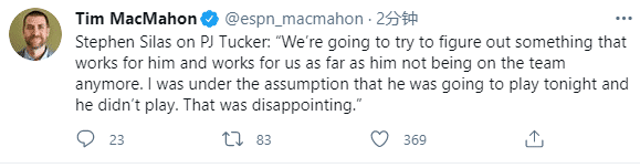 从火箭主帅的回应来看,算是实锤塔克拒绝上场表达内心的不满;赛后赛拉斯更是宣布重磅消息,塔克和火箭达成共识,塔克将不再为火箭出战,火箭正在努力寻找交易方案。