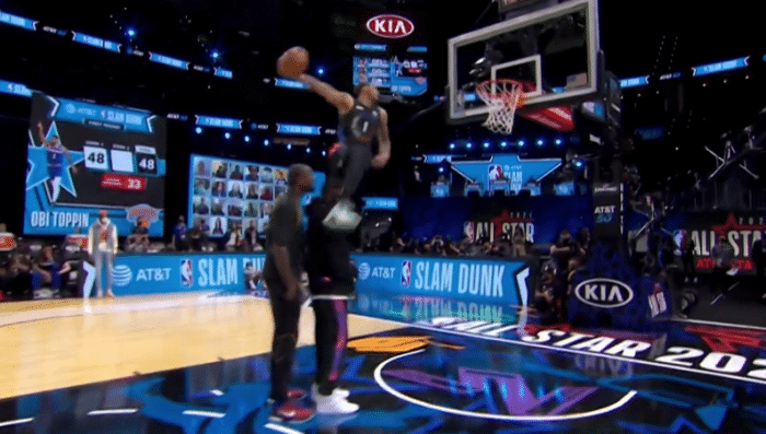 第三个出场的是安芬尼-西蒙斯,他的篮筐上还有一个框,起跳后平框,然后扣篮成功,得到46分。