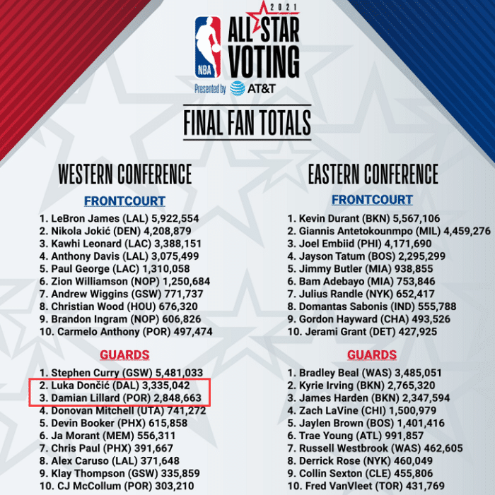 要知道的是除了球迷投票东契奇占优之外,其他的两项球员投票、媒体投票都是利拉德占据优势,所以不少人为这个赛季不论是个人表现还是球队表现都更加出色的利拉德落选感到非常遗憾。