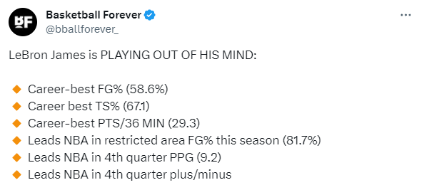 赛季至今的前13场比赛,詹姆斯的投篮命中率58.6%、两分球命中率68%、有效命中率65.2%、真实命中率67.1%、篮下命中率81.7%、中距离跳投命中率47%、非底角三分命中率40%,这七项数据都创生涯新高。