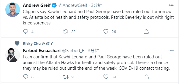 来源:24直播网01-26 10:1124直播网1月26日讯 快船队大麻烦来了,小卡和乔治两大巨星被隔离缺席比赛,据多位名记报道,小卡和乔治都因遵守联盟安全和健康防疫协议从而无法出战和老鹰的比赛,原因是小卡和乔治都触发新冠接触追踪机制,没有随队出征,快船记者Farbod Esnaashari更是预测乔卡可能被隔离到本周末。