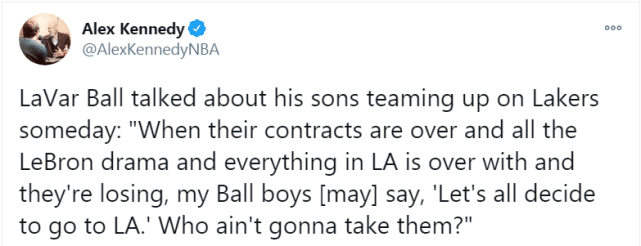 “当他们的合同全部到期,勒布朗在洛杉矶的戏剧和一切终结后,湖人会开始输球,我的球家三兄弟可能会说‘让我们全部决定去洛杉矶吧’谁会不想要他们?’浓眉合同到期会离开,詹姆斯也走了,我的意思是你们需要新噱头,而且需要赢球!现在,球家兄弟可以说‘我们重回洛杉矶怎样?’”