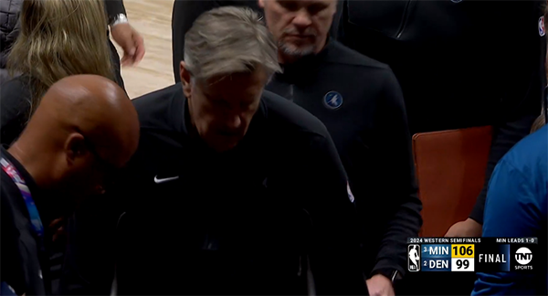 赛后爱德华兹一脸严肃,森林狼主帅芬奇拄着双拐离开球场。