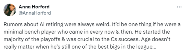 霍福德的妹妹发推回应:关于艾尔(霍福德)退役的传闻总是很奇怪。如果他是一个在替补席偶尔才有机会出场的球员,那就算了。但他是在季后赛大部分比赛里首发出场,并且对凯尔特人这赛季取得成功至关重要的球员;当他仍然是联盟中最好的大个子之一时,年龄其实并不重要了。