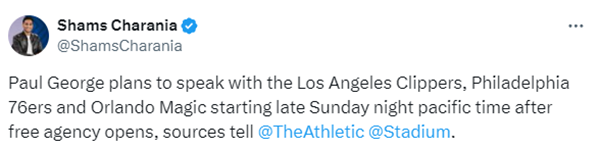 Chris Haynes跟进报道,76人预计会积极追求保罗-乔治,并且是乔治争夺战的有力竞争者。Michael Scotto也表示76人将强烈追求乔治,他们拥有足够的薪资空间。