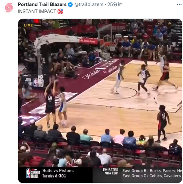上半场,崔永熙替补上场4分34秒,3投2中拿到6分1助攻,短短30秒连中两记三分,开拓者官方连续发推盛赞:崔永熙第二节一开始连中两记三分;然后一个绝妙的助攻,给到克林根,疯狂的影响力!