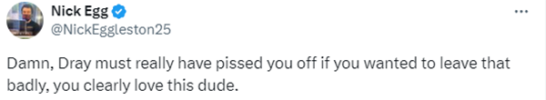 球迷在杜兰特的评论区写道:可恶,如果当你真的那么想要离开勇士,那一定是追梦格林惹恼了你,显然你很喜欢库里。