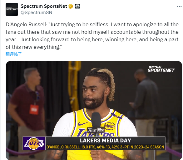 谈到对自己新赛季表现的期许,拉塞尔表示:我要为我时不时出现的不职业态度和没有把球队放在首位的心态道歉。今年我会改变这一点,我会整年保持专注,无论我们是否正在经历起伏。