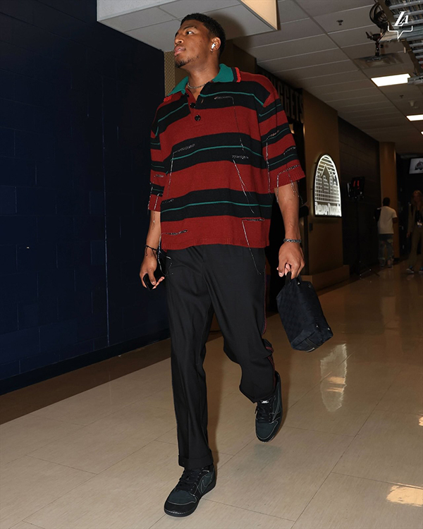 掘金官方还晒出其他球员的入场照,戈登身穿酒红色的新潮服饰还喝着奶茶,这打扮太潮了;贾斯汀-霍乐迪身穿一套绿色服装,小波特则是穿着牛仔裤入场。