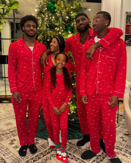 詹姆斯还晒出一家五口大合影,一家人都身穿圣诞款红色睡衣,老詹搂着萨瓦娜和布莱斯,满脸笑容以及陶醉在幸福之中;朱莉站在C位,布朗尼站在妈妈旁边,一家五口太幸福了。