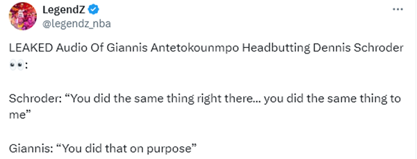 唇语专家解读了施罗德和字母哥的对话内容——施罗德突破上篮被字母哥犯规后,施罗德坐在地板上抱怨:拜托!看看这个屎动作;之后施罗德在防守中推倒字母哥,克劳德为字母哥出头,之后坐在地板上的字母哥暴怒顶牛施罗德,最终他们三人都吃到技术犯规。