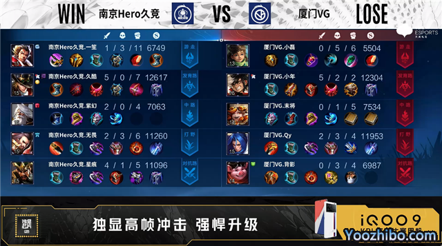 开局南京Hero五人中路抢线击杀公孙离拿到一血。1分43秒野区团战厦门VG打出0换2。2分42秒厦门VG中路击杀不知火舞。3分09秒厦门VG发育路击杀镜。4分55秒厦门VG拿下暴君。5分26秒南京Hero对抗路击杀马超。6分53秒厦门VG中路击杀鲁班大师。7分49秒厦门VG中路击杀镜。8分22秒厦门VG摧毁敌方发育路二塔。9分08秒南京Hero对抗路击杀马超。9分27秒主宰处团战厦门VG击杀夏侯惇。10分15秒发育路团战南京Hero打出1换2。11分34秒野区团战南京Hero打出0换3。12分08秒南京Hero摧毁敌方中路高地塔。15分10秒南京Hero拿下暗影暴君。15分43秒中路团战南京Hero打出0换3。16分08秒南京Hero团灭对手摧毁水晶拿下比赛。