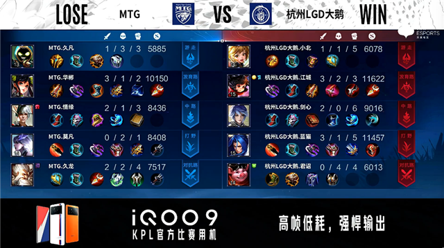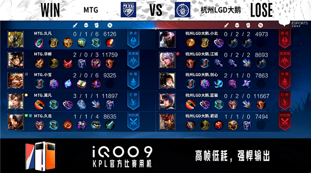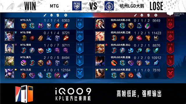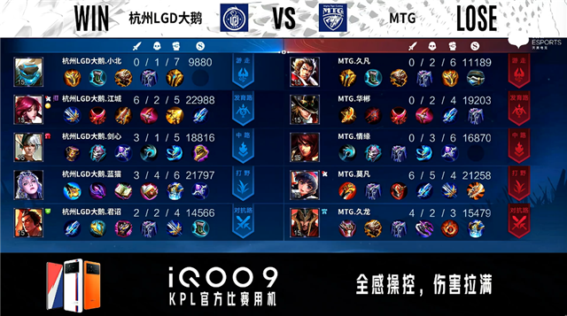 开局杭州LGD大鹅孙尚香中路抢线。1分56秒MTG对抗路击杀镜拿到一血。3分18秒MTG拿下暴君。10分47秒MTG拿下暗影暴君,杭州LGD大鹅拿下暗影主宰。13分10秒中路团战杭州LGD大鹅打出1换3,孙尚香拿到三连决胜。15分24秒杭州LGD大鹅拿下暗影暴君。15分33秒杭州LGD大鹅摧毁敌方对抗路高地塔。16分21秒MTG中路击杀太乙真人。20分03秒MTG野区击杀太乙真人。21分30秒中路团战MTG打出0换4。21分55秒MTG团灭对手摧毁水晶拿下比赛。
