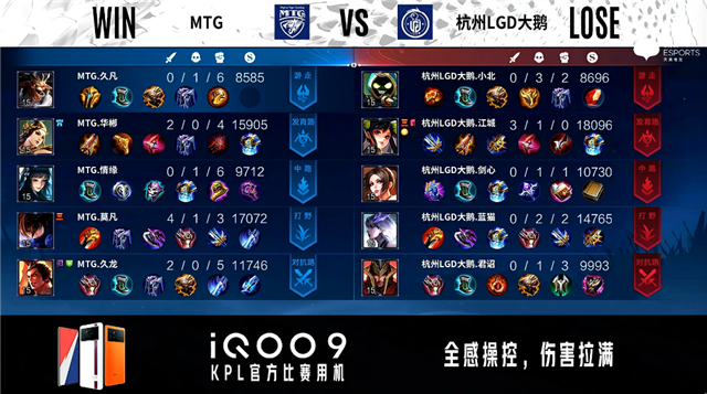 双方常规开局。2分10秒杭州LGD大鹅发育路击杀狄仁杰拿到一血。3分20秒MTG中路击杀沈梦溪。5分53秒对抗路团战MTG打出0换2。7分40秒MTG拿下暴君。10分45秒杭州LGD大鹅拿下暗影主宰。11分34秒MTG拿下暗影暴君。13分30秒MTG摧毁敌方中路外塔。14分34秒杭州LGD大鹅摧毁敌方对抗路二塔。14分38秒杭州LGD大鹅摧毁敌方发育路二塔。15分44秒发育路团战MTG打出1换3。16分13秒MTG发育路击杀沈梦溪。16分25秒MTG团灭对手摧毁水晶拿下比赛。