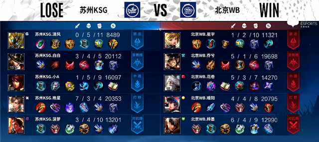 1分钟北京WB入侵蓝区,橘右京拿下一血。3分半暴君团,露娜被击杀,橘右京拿下暴君。5分15秒马可波罗被击杀。6分11秒中路团战,双方1换1。6分20秒橘右京推掉上路一塔。7分钟橘右京拿下主宰。8分钟露娜拿下暴君。9分钟中路团战,双方1换1,苏州KSG中路一塔被破。10分21秒橘右京拿下主宰。11分50秒暴君团,北京WB打出0换3,弈星拿下暴君。12分33秒北京WB推掉水晶率先拿下赛点。