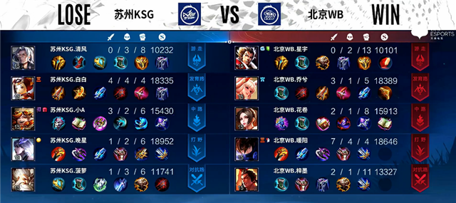 1分钟苏州KSG入侵野区,马超拿下一血,团战苏州KSG打出3换2。3分钟澜拿下暴君。4分钟中路团战,双方1换1。4分30秒杨玉环被击杀。6分钟阿古朵拿下主宰。6分32秒中路团战,苏州KSG打出1换2。7分30秒澜拿下暴君。8分10秒野区团战,苏州KSG打出0换3。9分钟李元芳推掉中路一塔。9分17秒野区团战,双方2换2。10分25秒澜拿下暴君。11分钟澜拿下主宰。14分30秒苏州KSG推掉中路高地塔,团战打出0换2。15分钟苏州KSG团灭北京WB推掉水晶追回一分。